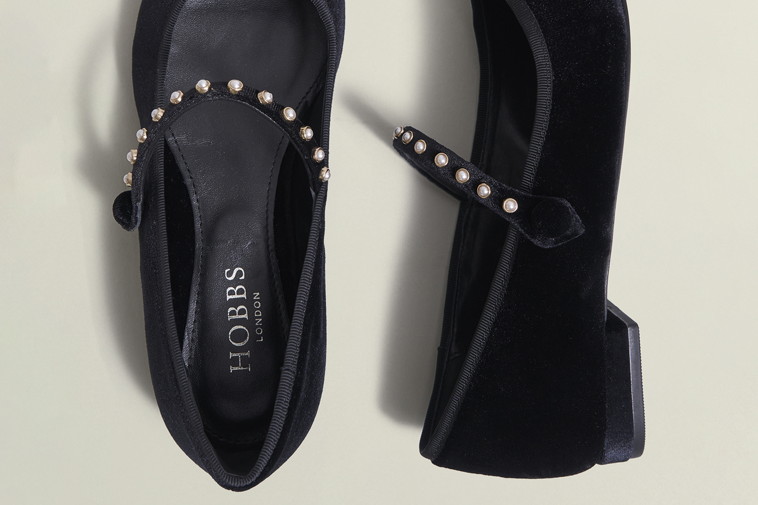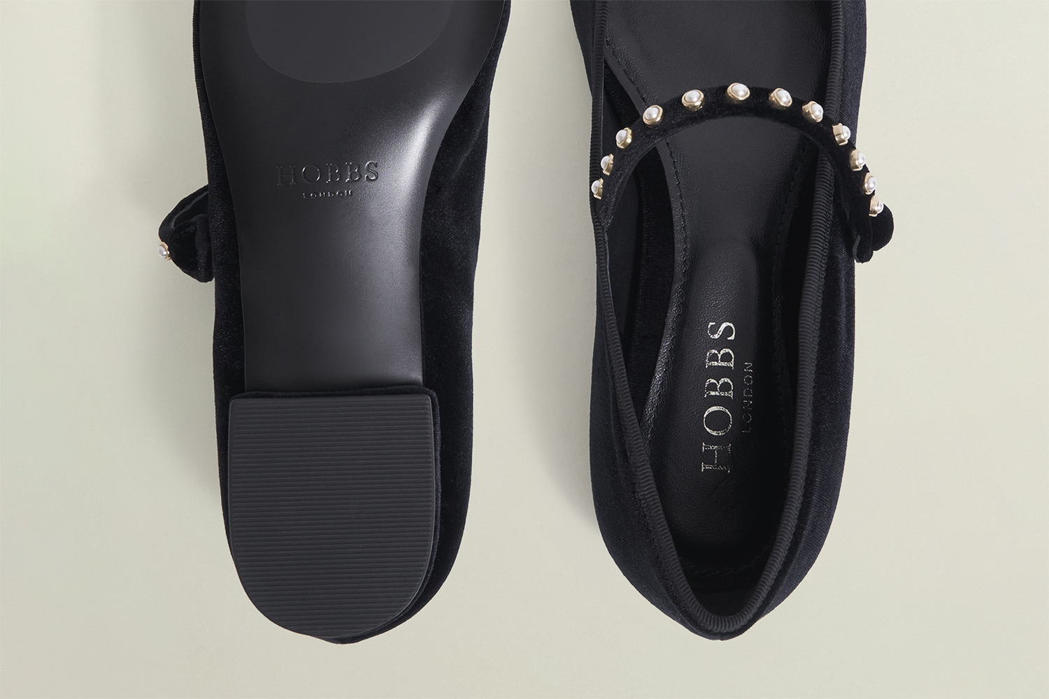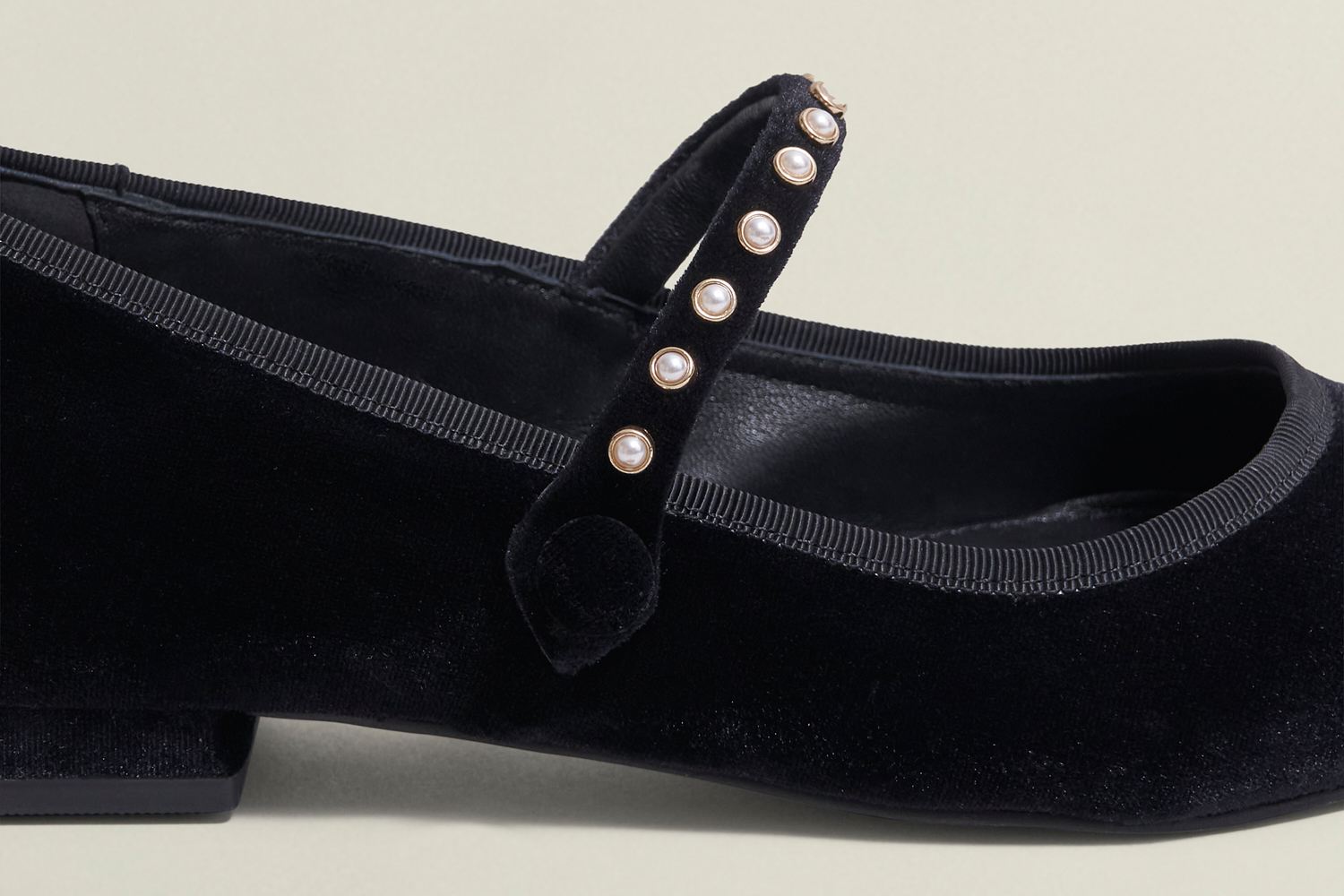 In luxurious velvet with pearl accents, the Juliana ballet flat lends a luxurious finish to seasonal outfits. Day or night.