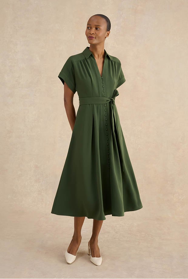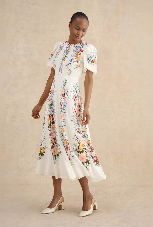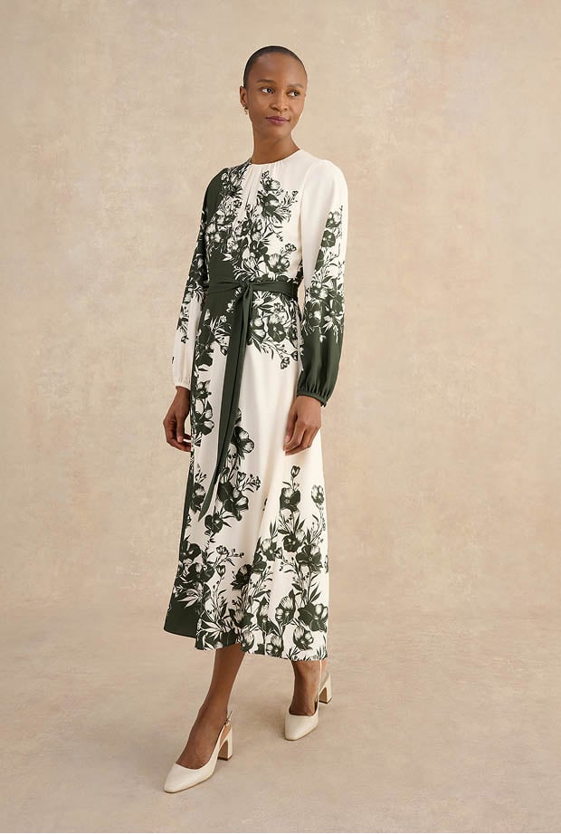 Punchy shades of paprika, with hints of olive and peach. Blouson sleeves and contoured waistlines, with bold botanical prints. This is occasion dressing, with romantic appeal.