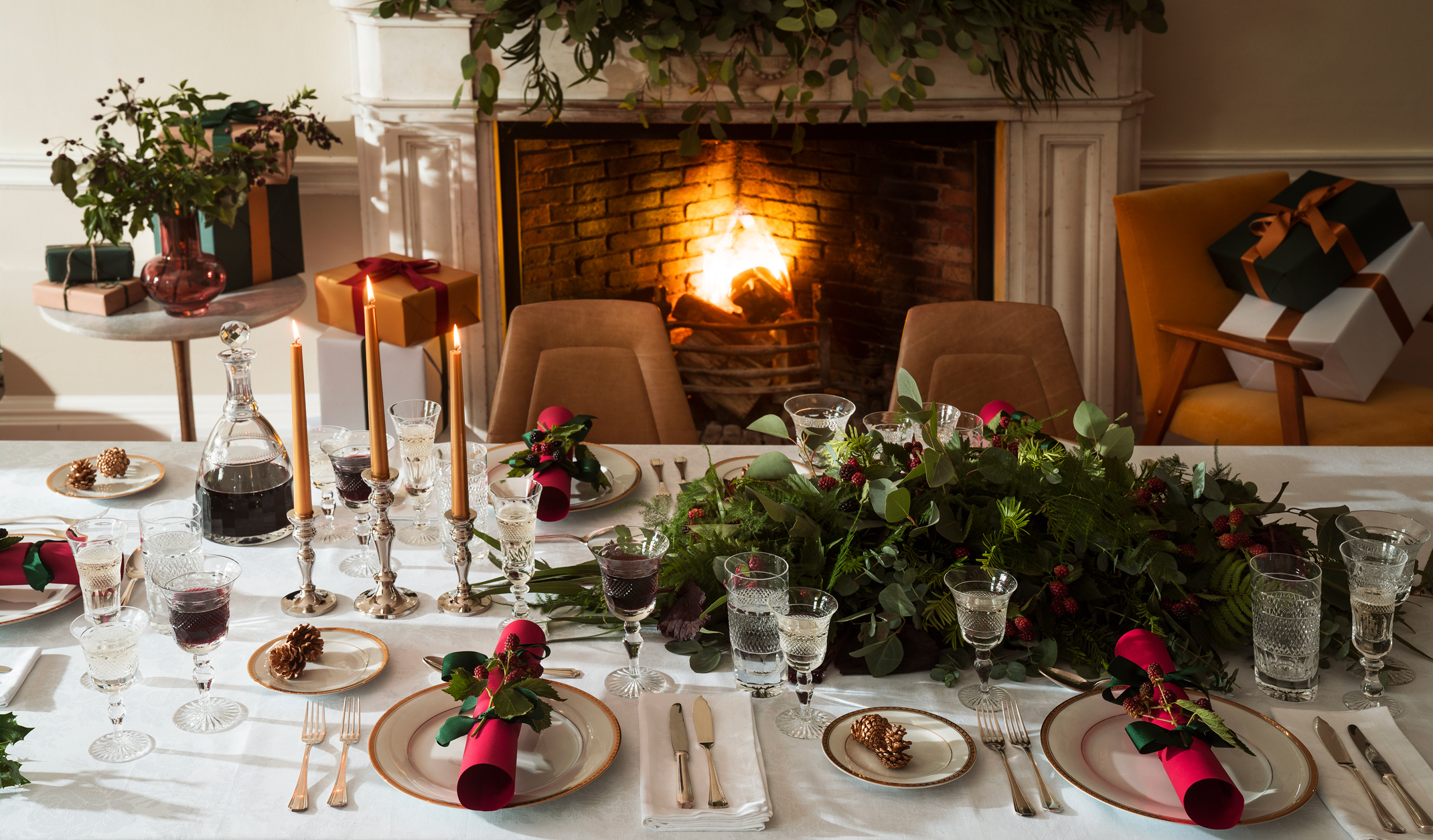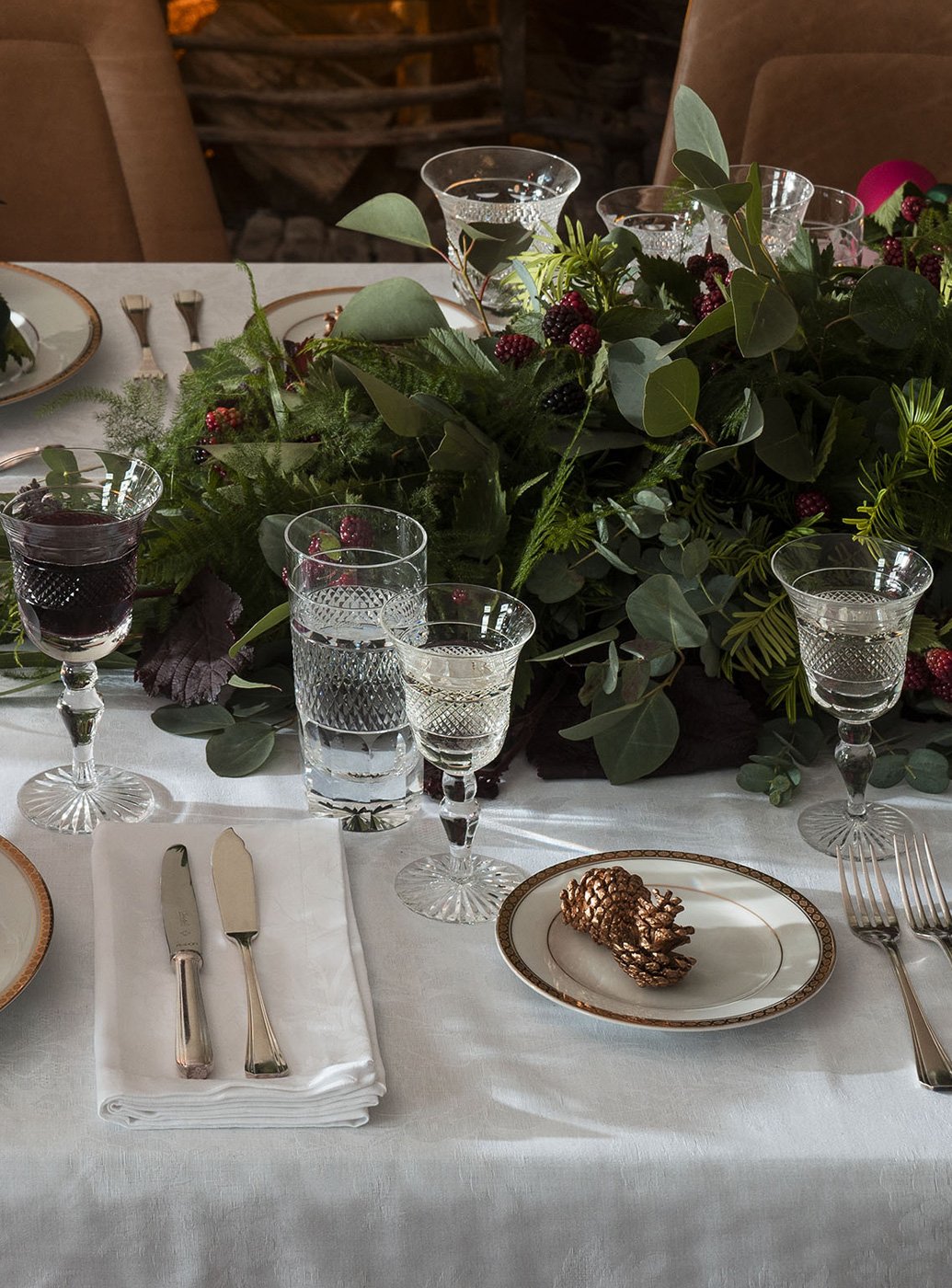 Using seasonal greenery is my favourite way to create a centrepiece. Mixing shades of green foliage achieves a textured look and red berries will add rich, vibrant colour. Arrange them low to avoid creating a conversation barrier.