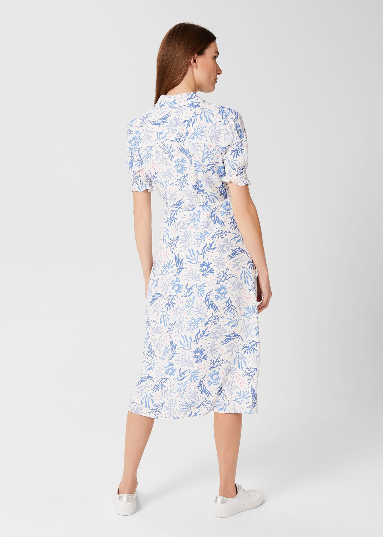 Evocative of summer days, the endlessly feminine Elora tea dress features a playfully chic coral print that was hand-drawn in our London studio.