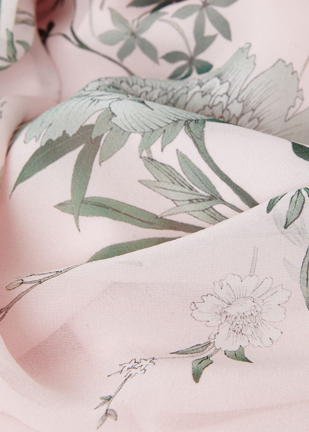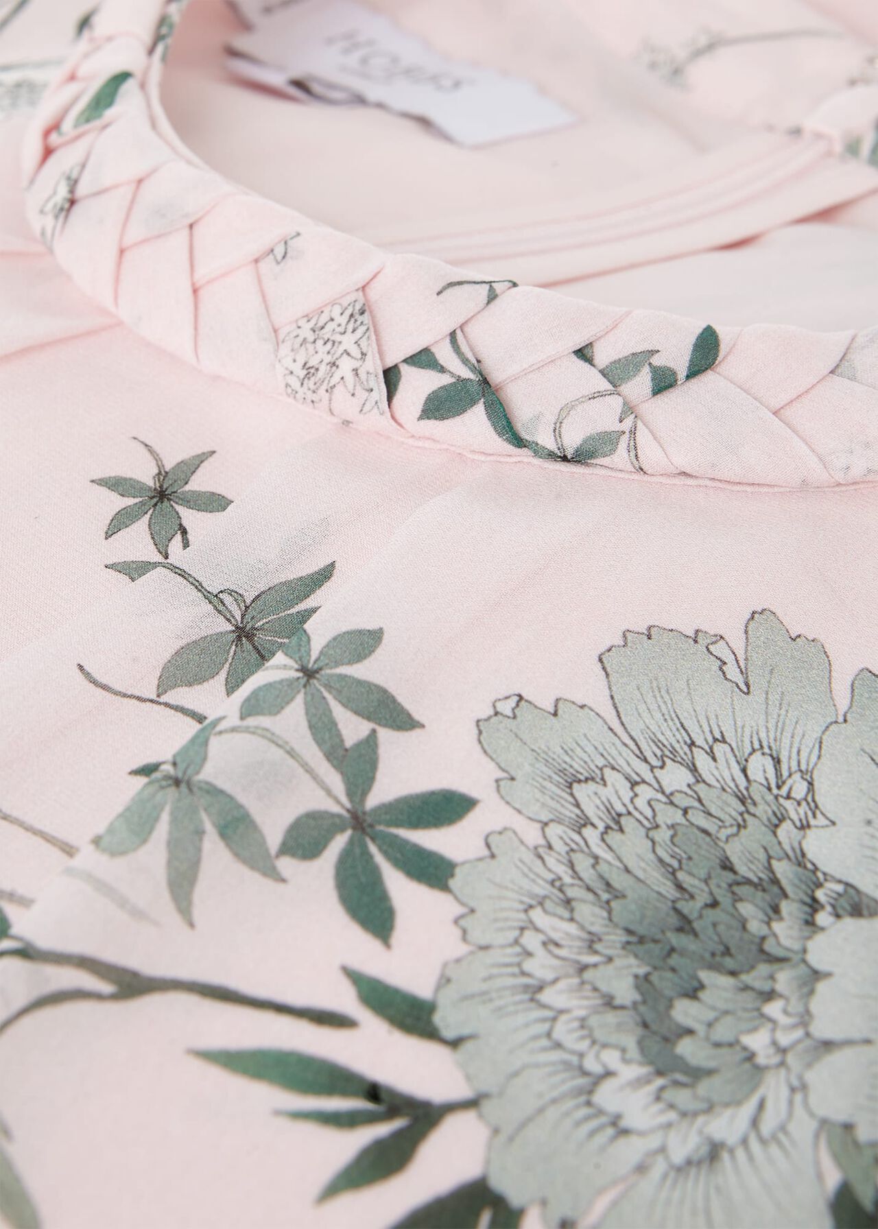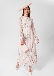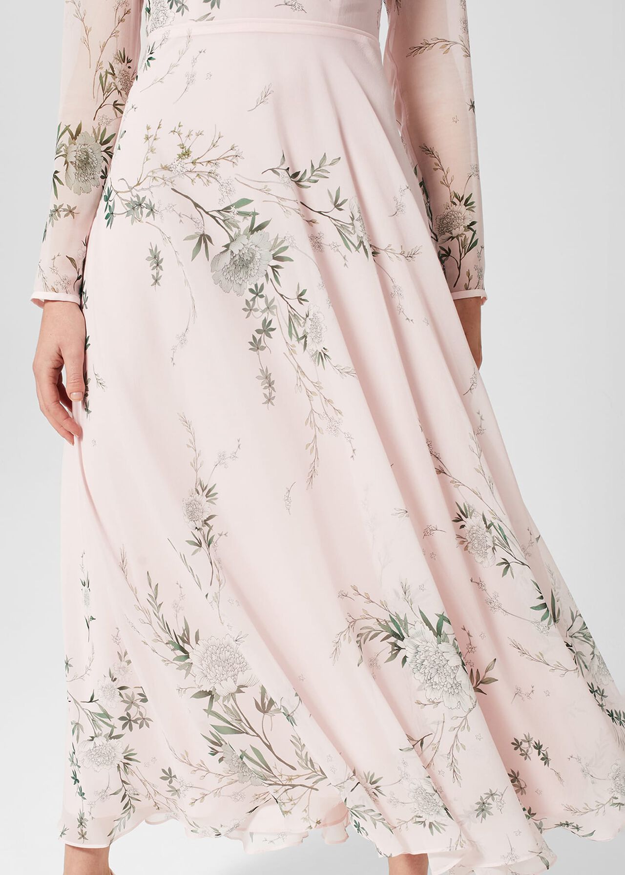 Effortless elegance for any occasion. We've reimagined our bestselling Rosabelle silk dress with a romantic, sage green floral print on a pale pink base, inspired by design archives.