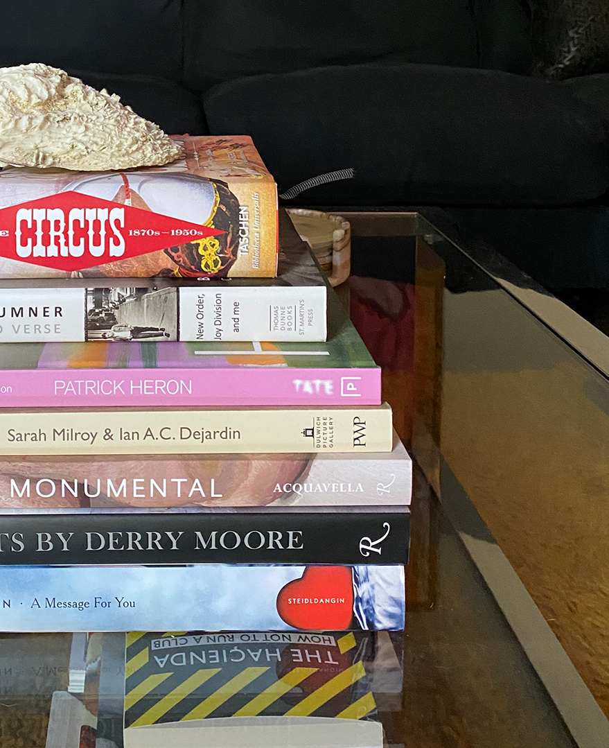 A pile of books on Jason's coffee table